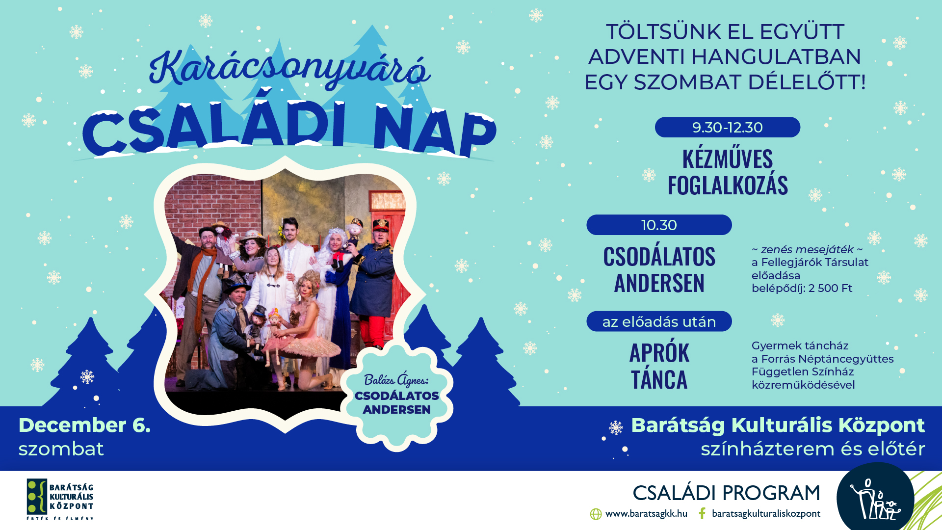 Töltsünk el együtt adventi hangulatban egy szombat délelőtt, ahol karácsonyváró kézműveskedéssel, táncházzal és családi színházzal várjuk a családokat!