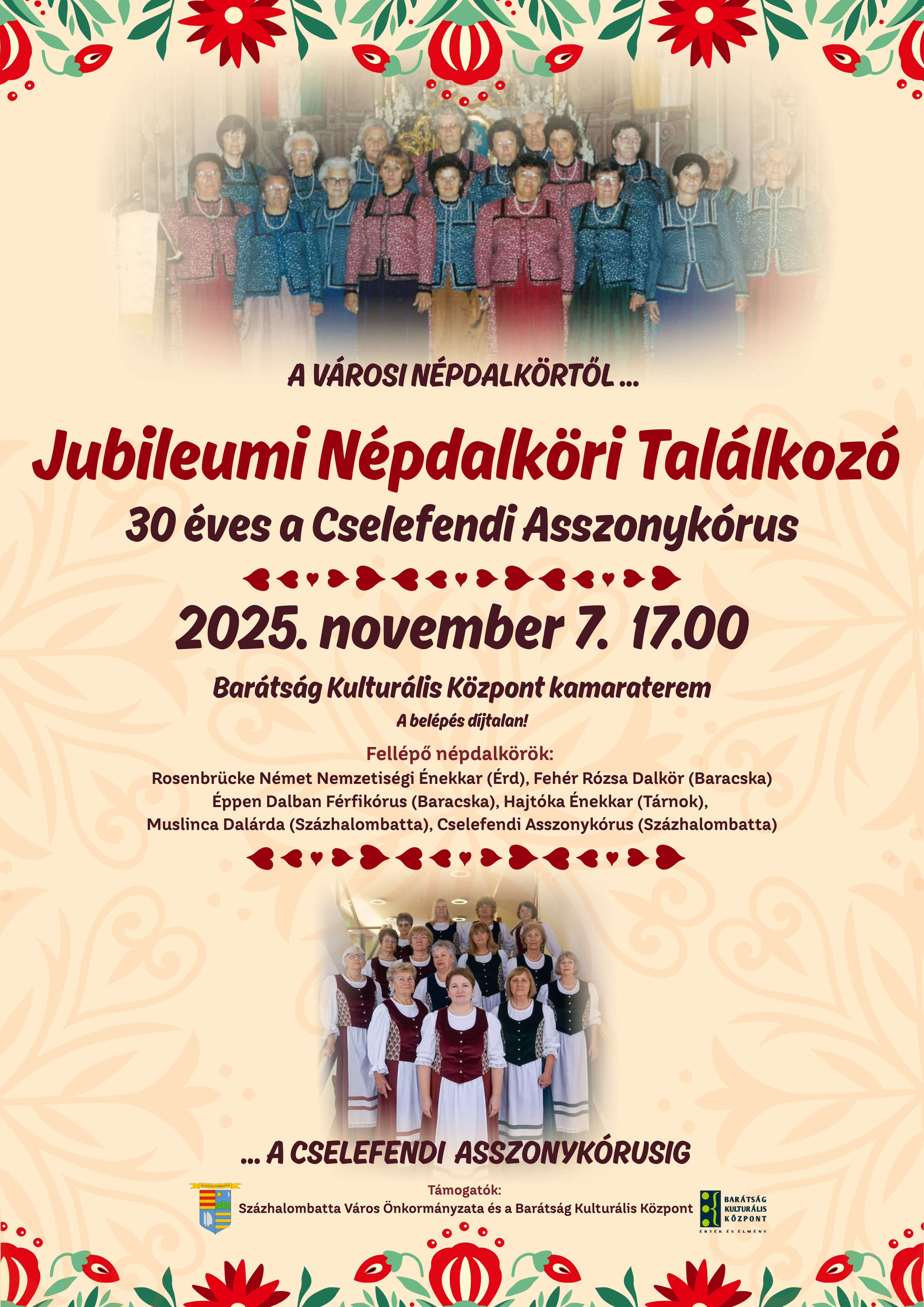 A Barátság Kulturális Központ szeretettel várja a közönséget a magyar népdalkultúrát ünneplő, különleges jubileumi estére. A Cselefendi Asszonykórus fennállásának 30. évfordulója alkalmából színes programmal és vendégkórusokkal készülünk.