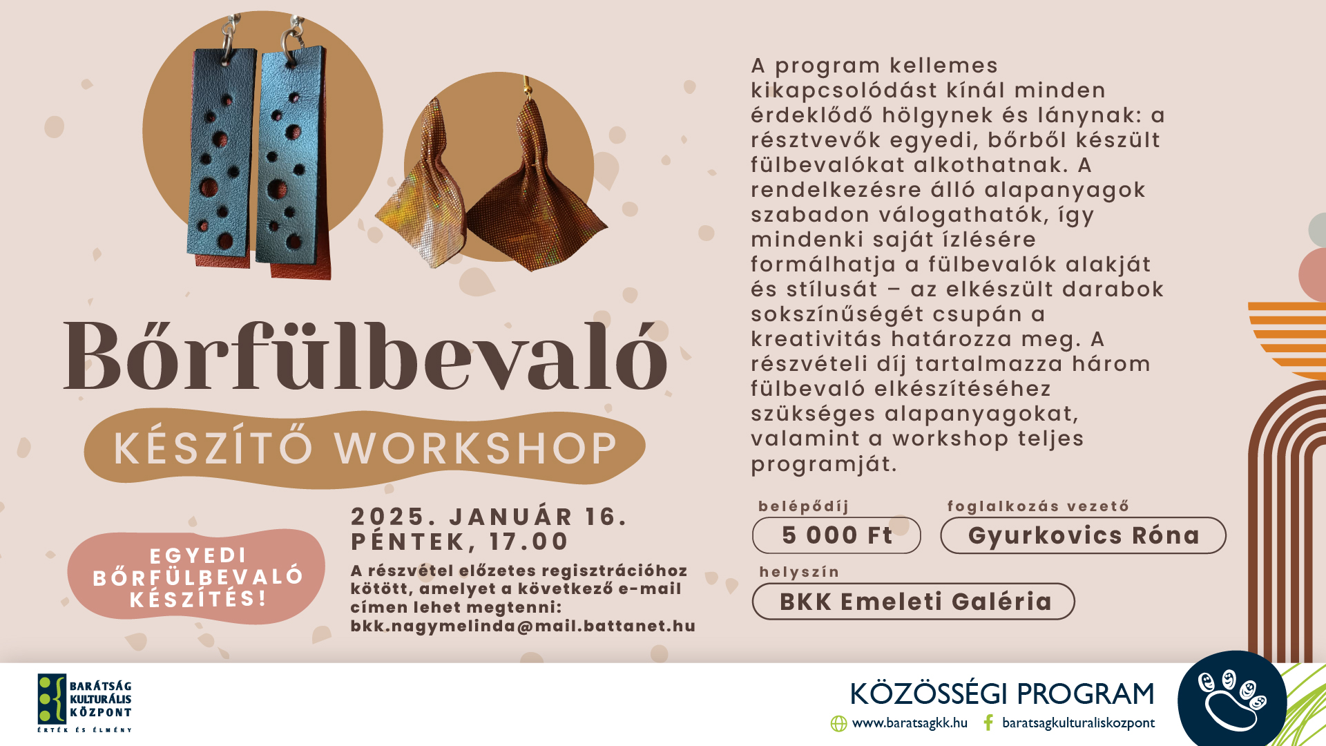 A program kellemes kikapcsolódást kínál minden érdeklődő hölgynek és lánynak: a résztvevők egyedi, bőrből készült fülbevalókat alkothatnak. A rendelkezésre álló alapanyagok szabadon válogathatók, így mindenki saját ízlésére formálhatja a fülbevalók alakját és stílusát – az elkészült darabok sokszínűségét csupán a kreativitás határozza meg. A részvételi díj tartalmazza három fülbevaló elkészítéséhez szükséges alapanyagokat, valamint a workshop teljes programját.