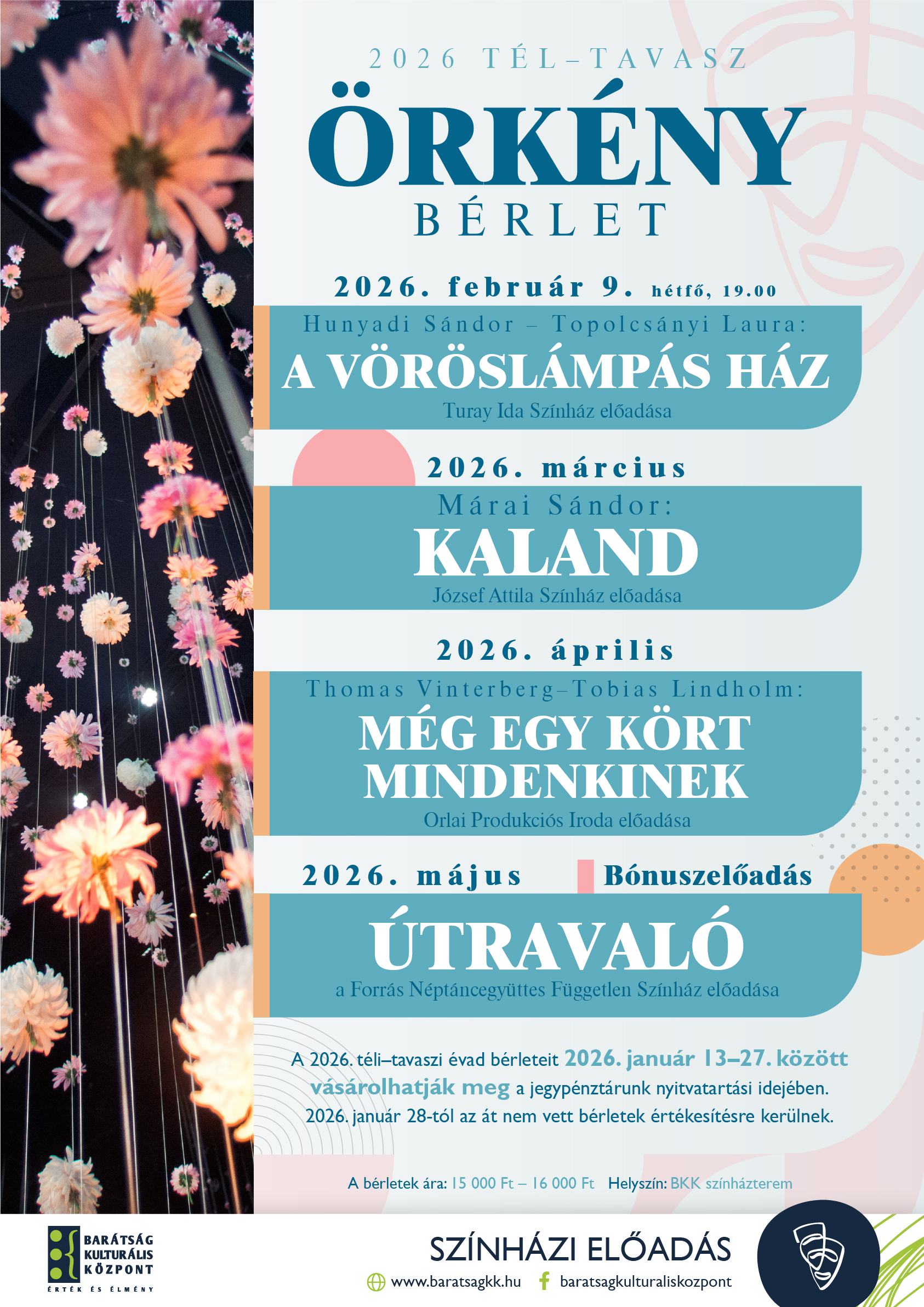 Tájékoztatjuk Önöket, hogy a 2026. téli–tavaszi évad bérleteit 2026. január 13–27. között vásárolhatják meg a jegypénztárunk nyitvatartási idejében.