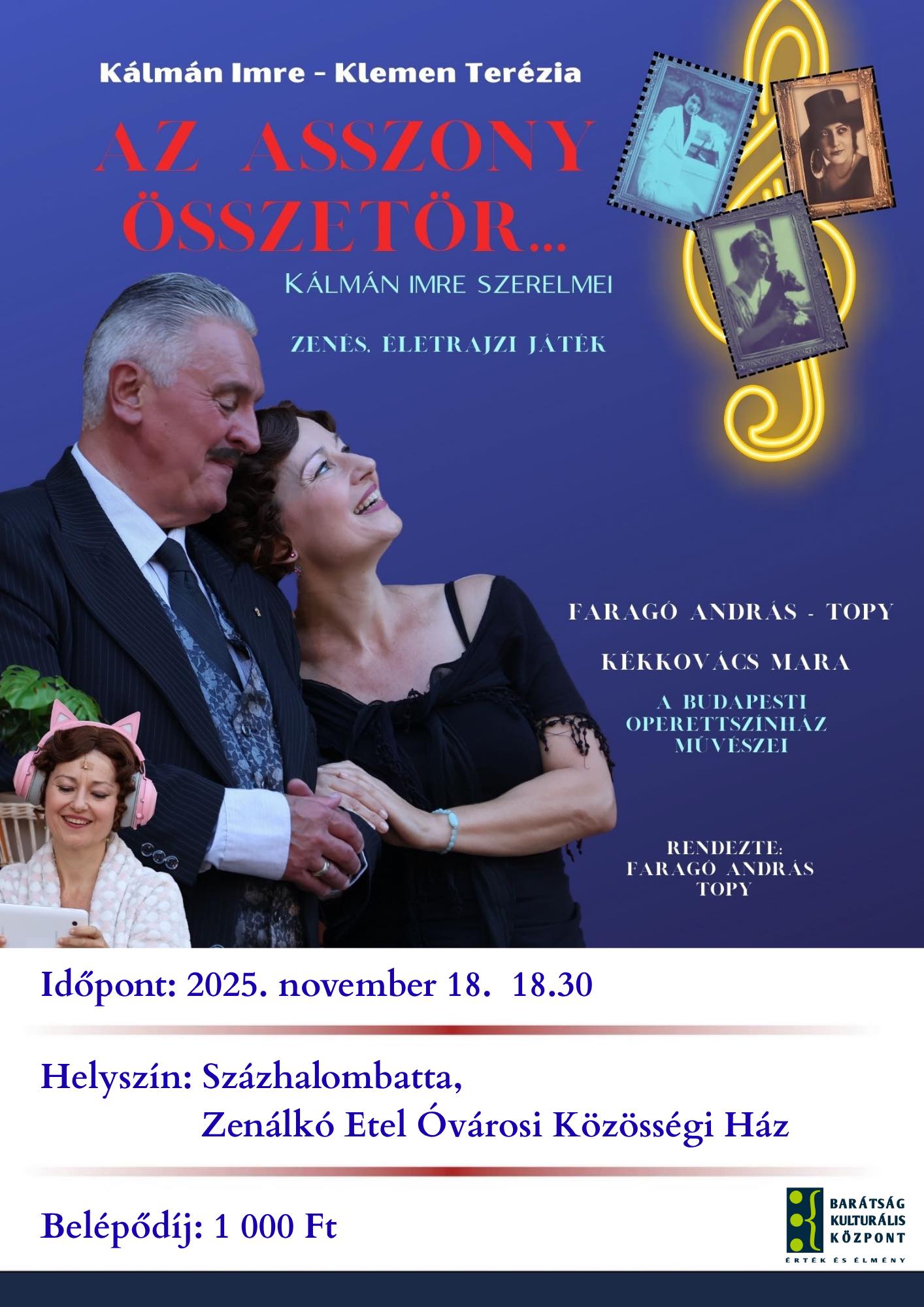Kálmán Imre és Klemen Terézia művének különleges előadását láthatják Százhalombattán, amely a világhírű zeneszerző életének és szerelmeinek történetét idézi meg. A zenés életrajzi játékot a Budapesti Operettszínház művészei hozzák el a közönségnek.